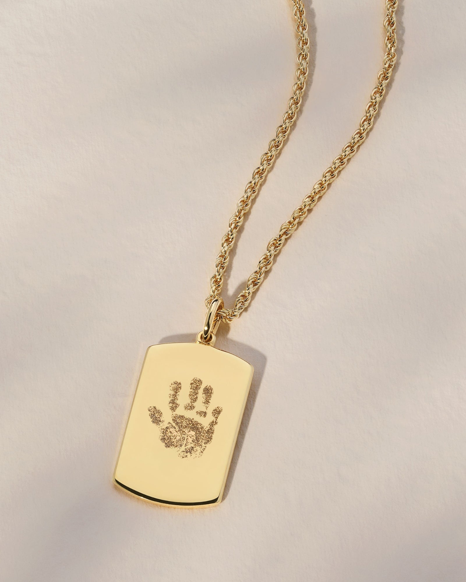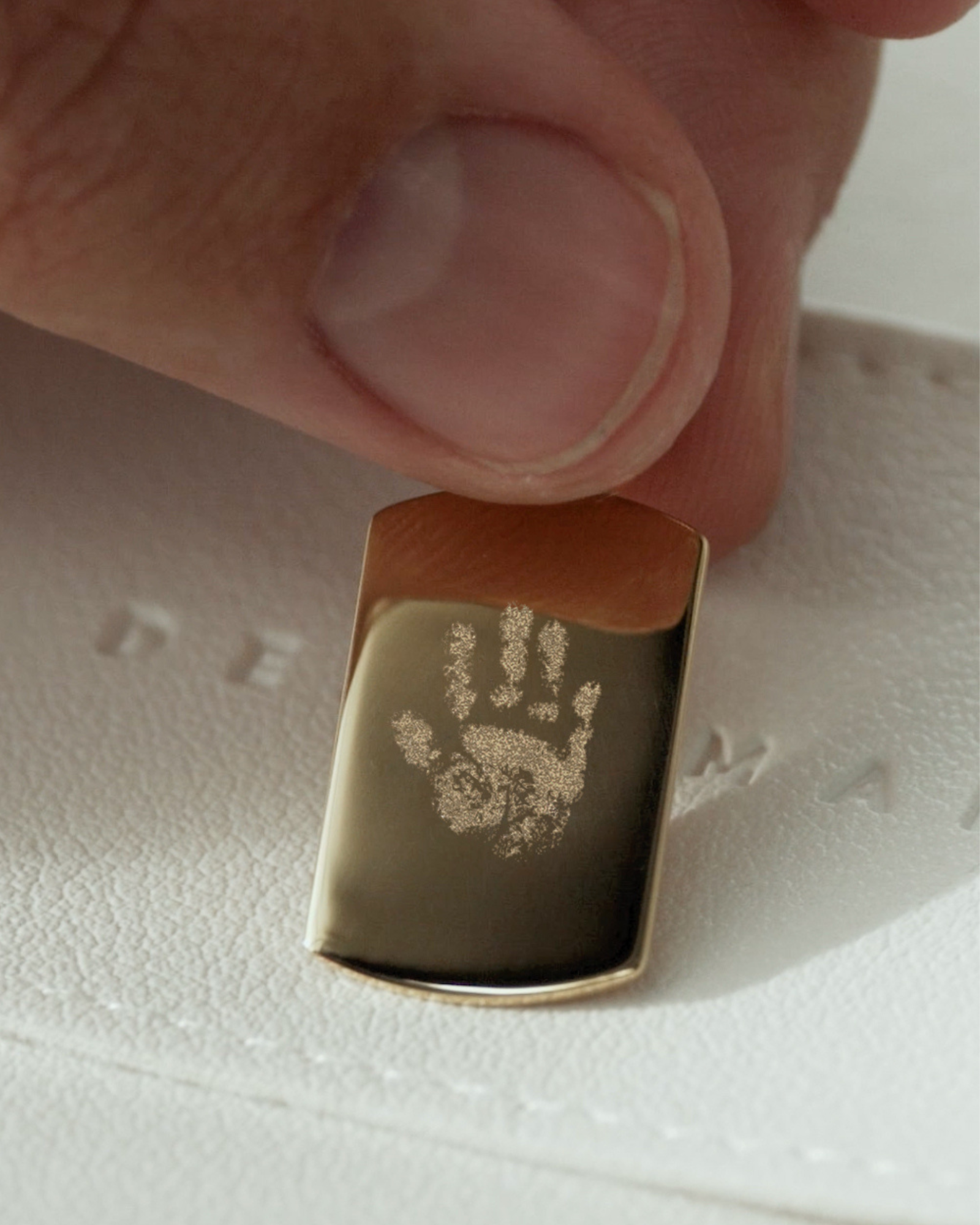 Our Handprint Tag Necklace isn’t just jewellery, it’s a piece of your story, worn close to the chest. Each tag is diamond-engraved with the exact handprint of your child, capturing every tiny line and detail with precision in our Sydney studio.