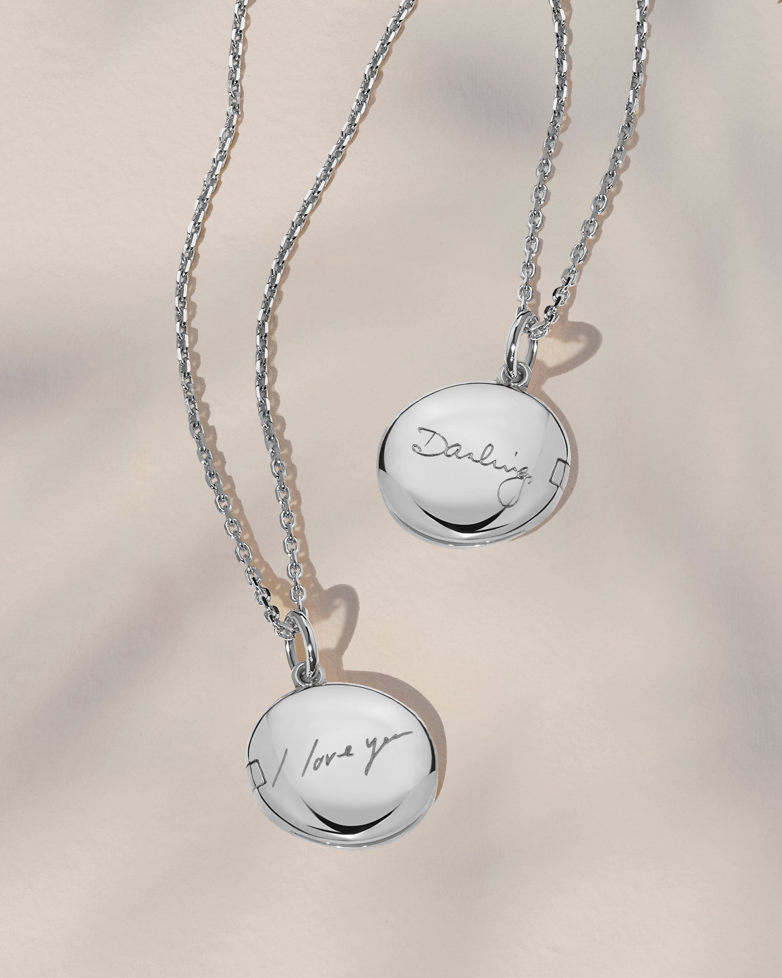 Each locket is diamond-engraved with the handwriting of someone you hold close, taken from an old birthday card, love letter, or drawing your child has brought home from school. Made to mirror the ink in exact detail, every piece is made to order with exceptional care in our Sydney studio, and opens to reveal space for two cherished photographs.