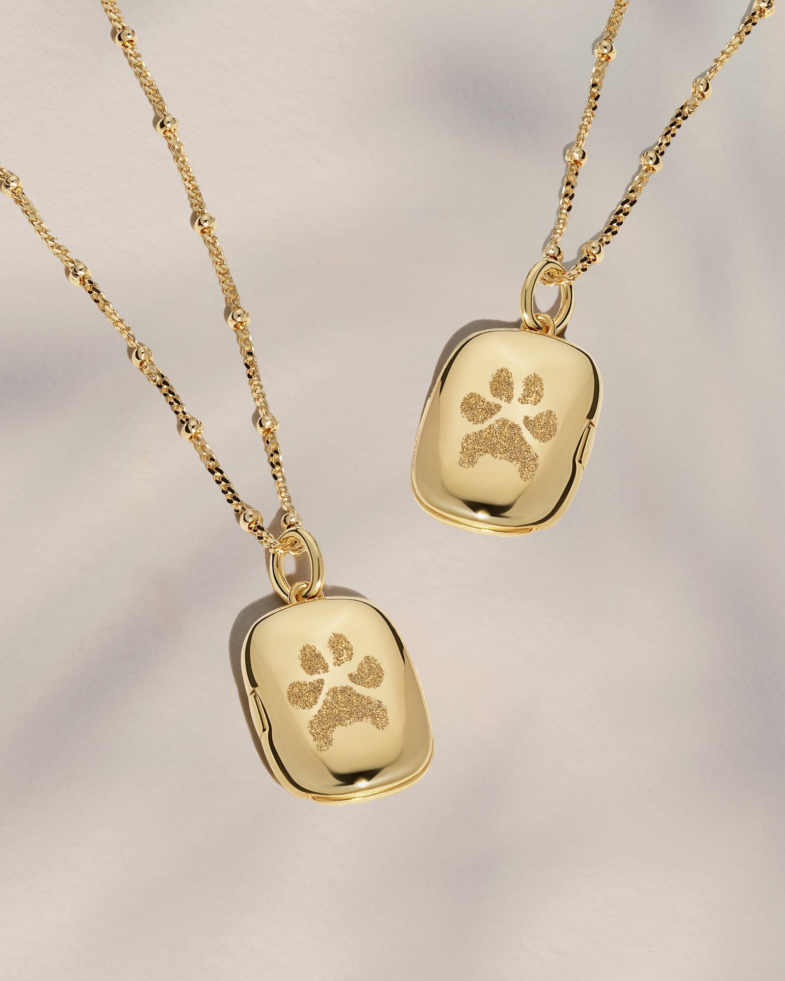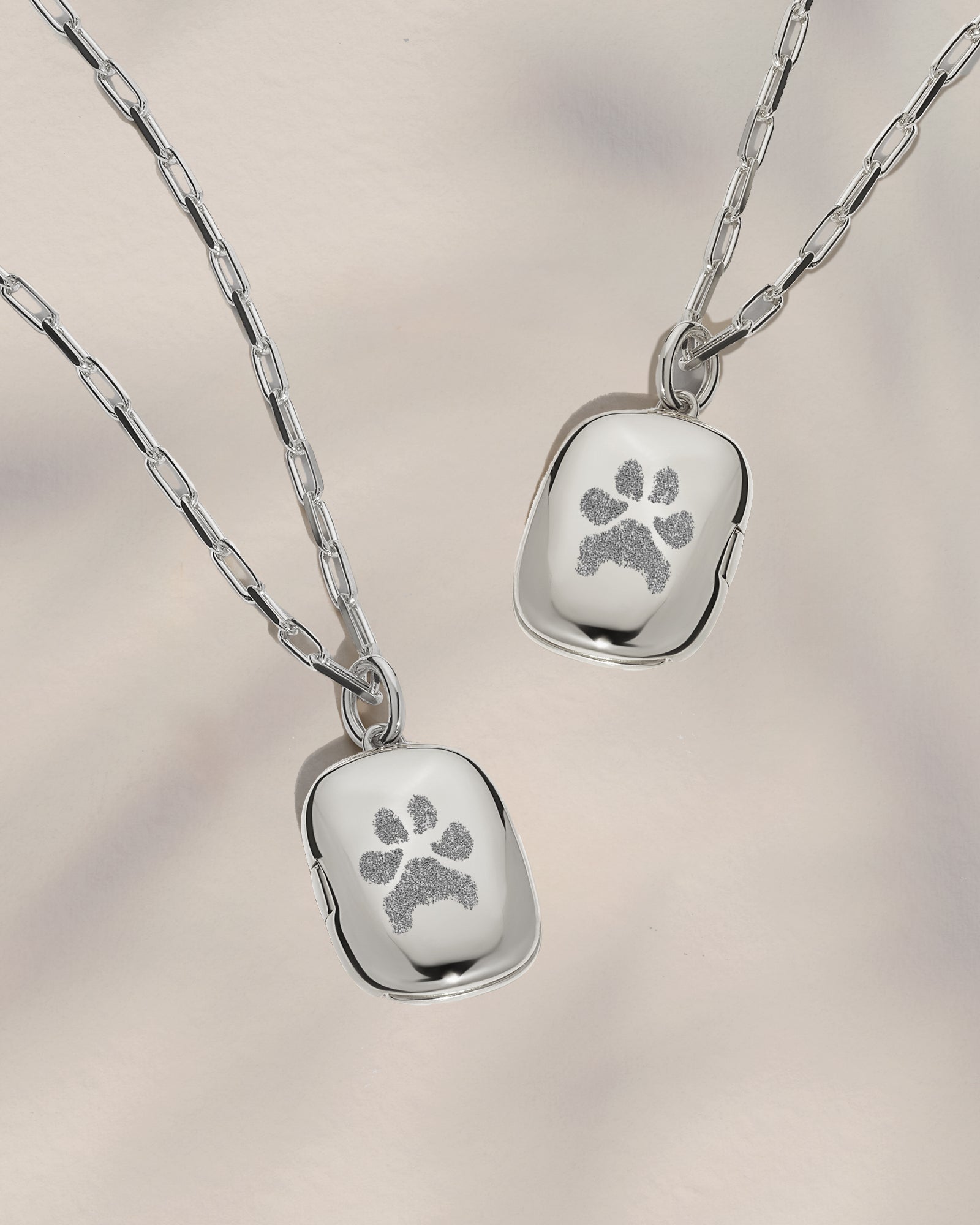 Our Double Sided Paw Print Locket Necklace immortalises the unique print of two beloved pets, and is a keepsake to honour the bond that never fades.