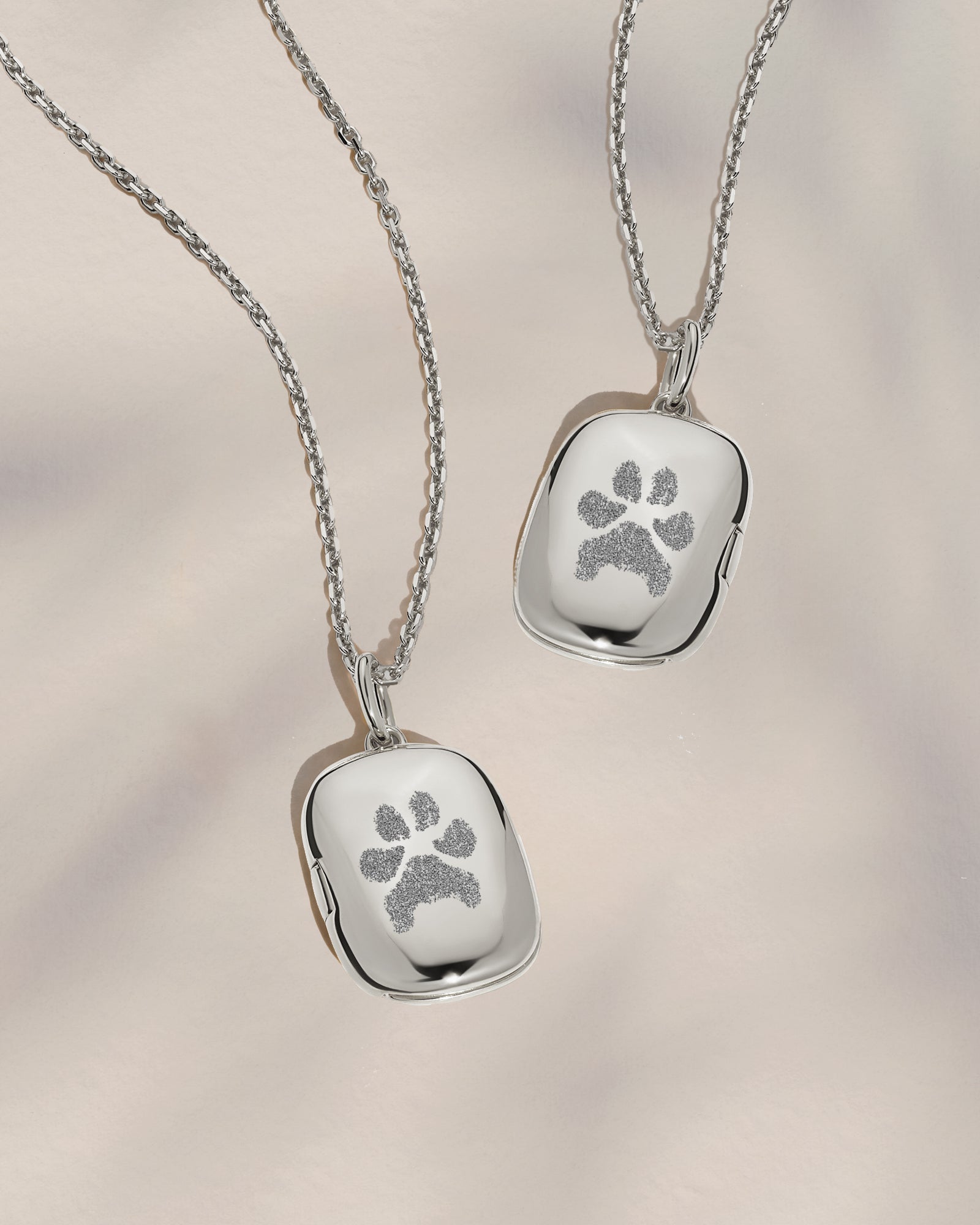 Each piece is diamond-engraved with remarkable precision, capturing every line and texture of their paw or nose print, and opens to reveal space for two cherished photographs.
