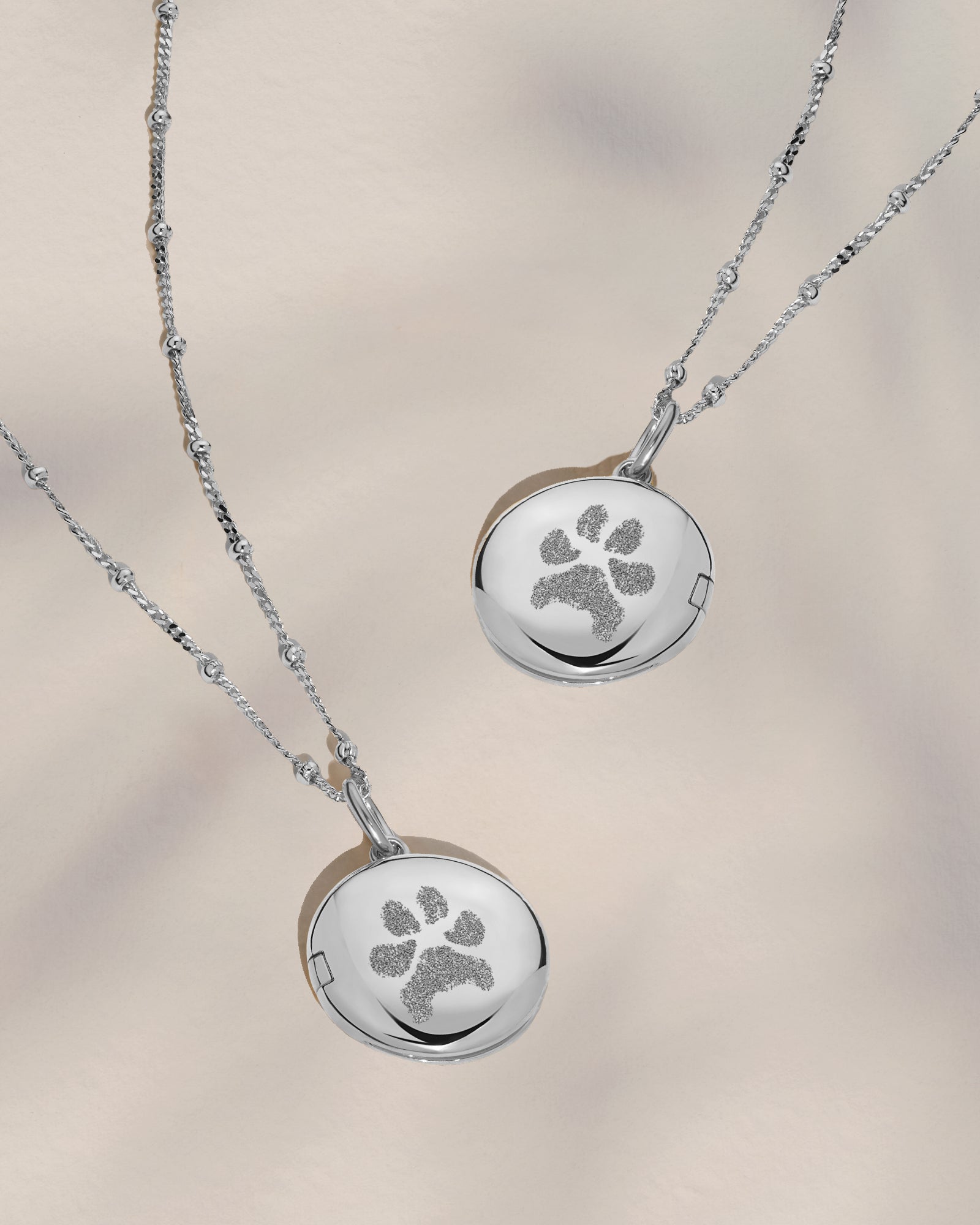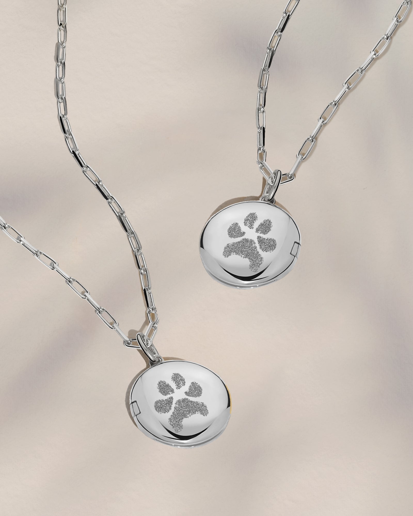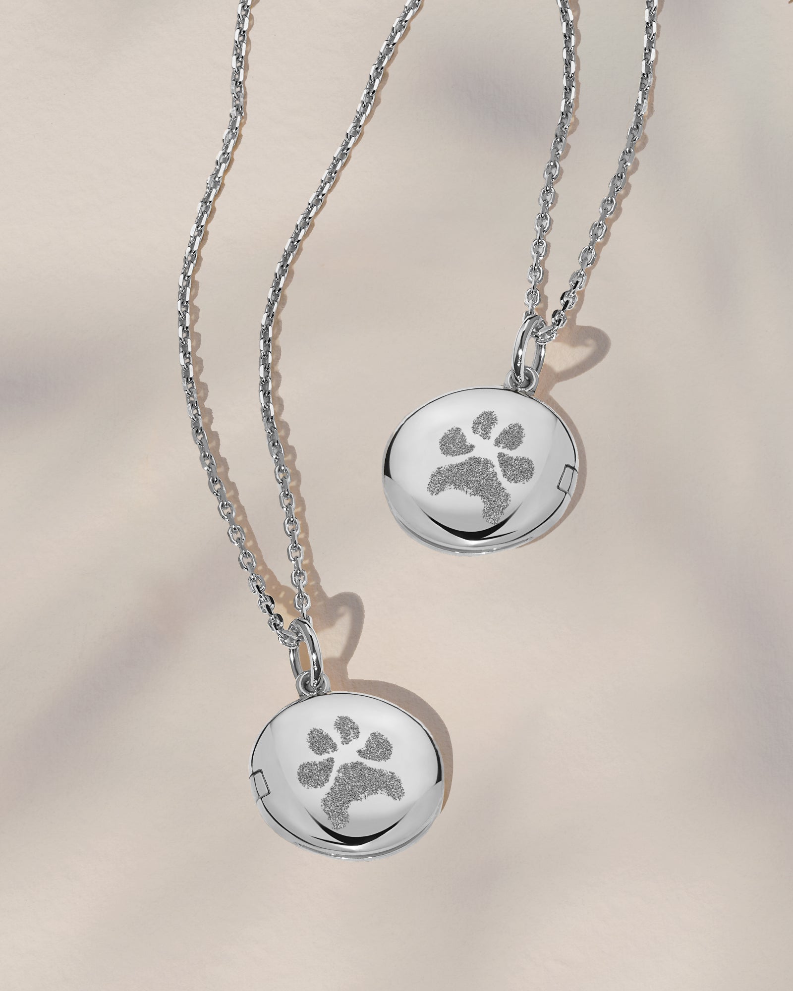 Our Double Sided Paw Print Locket Necklace immortalises the unique print of two beloved pets, and is a keepsake to honour the bond that never fades.