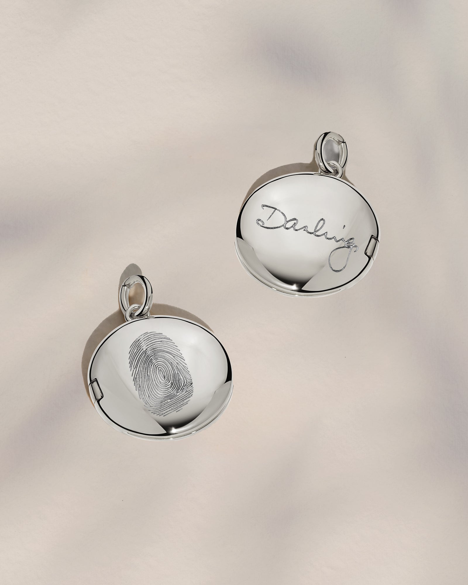 Each locket is diamond-engraved with the fingerprint of someone you hold close, and their handwriting on the other side. Whether it's your child, your partner, or your parent, each engraving mirrors the real prints in exact detail, and is made to order with exceptional care in our Sydney studio. All pendants open to reveal space for two cherished photographs.